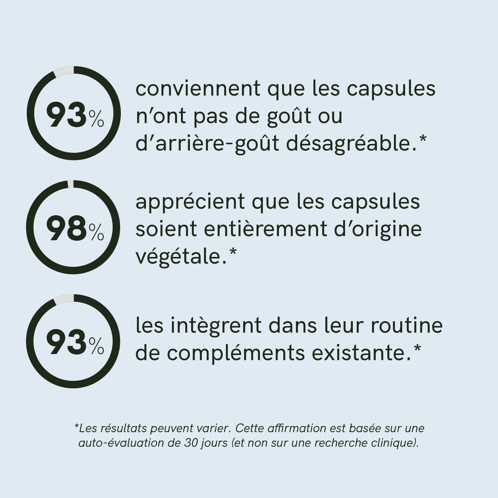 Les gélules sont fabriquées dans l’UE, sans gluten, sans huile de palme, véganes et testées en laboratoire. Elles sont stabilisées avec des extraits naturels de tocophérol et de romarin afin de garantir la plus grande pureté et qualité.