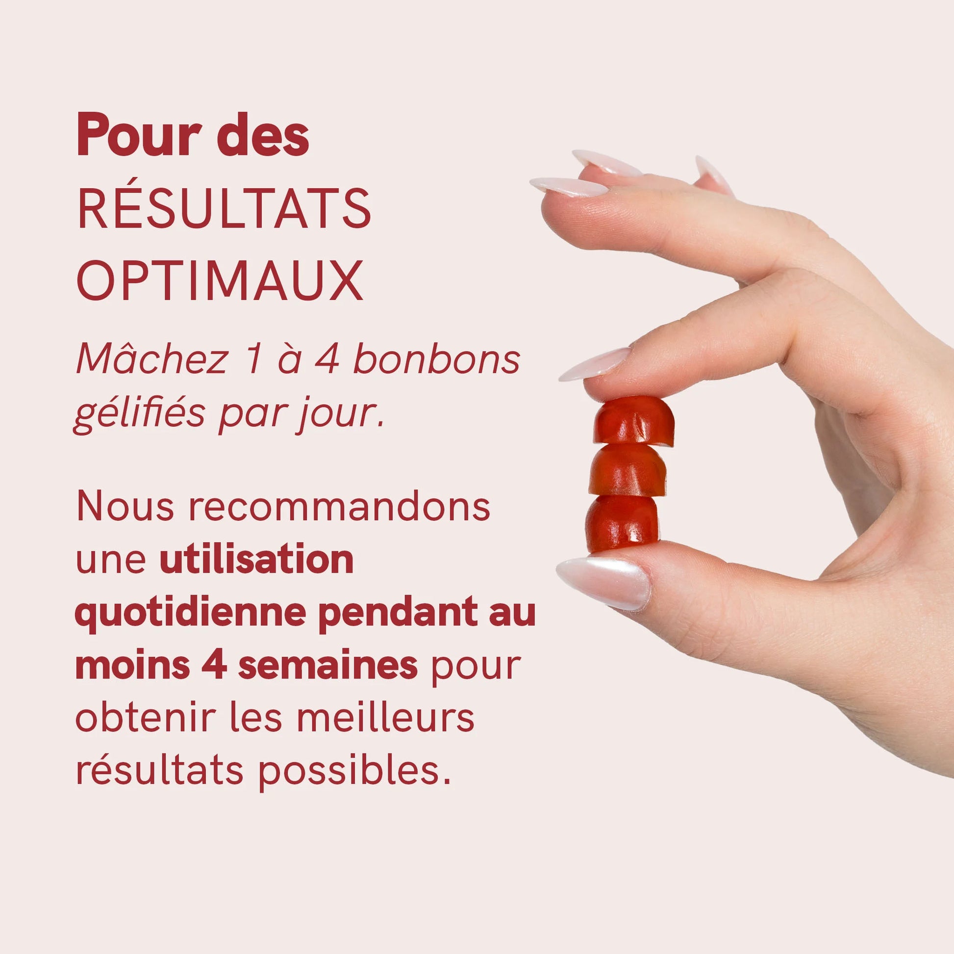 Mâcher 1 à 4 gommes aux fruits par jour, sauf recommandation contraire de votre médecin. Ne pas dépasser la dose journalière maximale de 4 gommes. 1 gomme = 15 mg CBD