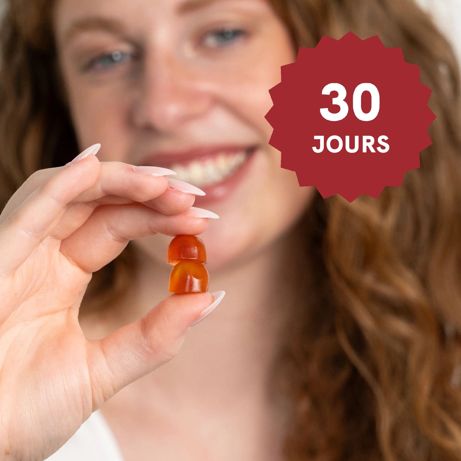 Chaque boîte contient 60 CBD Gummies, qui vous offrent jour après jour un supplément de bien-être et d’équilibre. Veuillez noter que ce produit n’est pas adapté aux enfants.