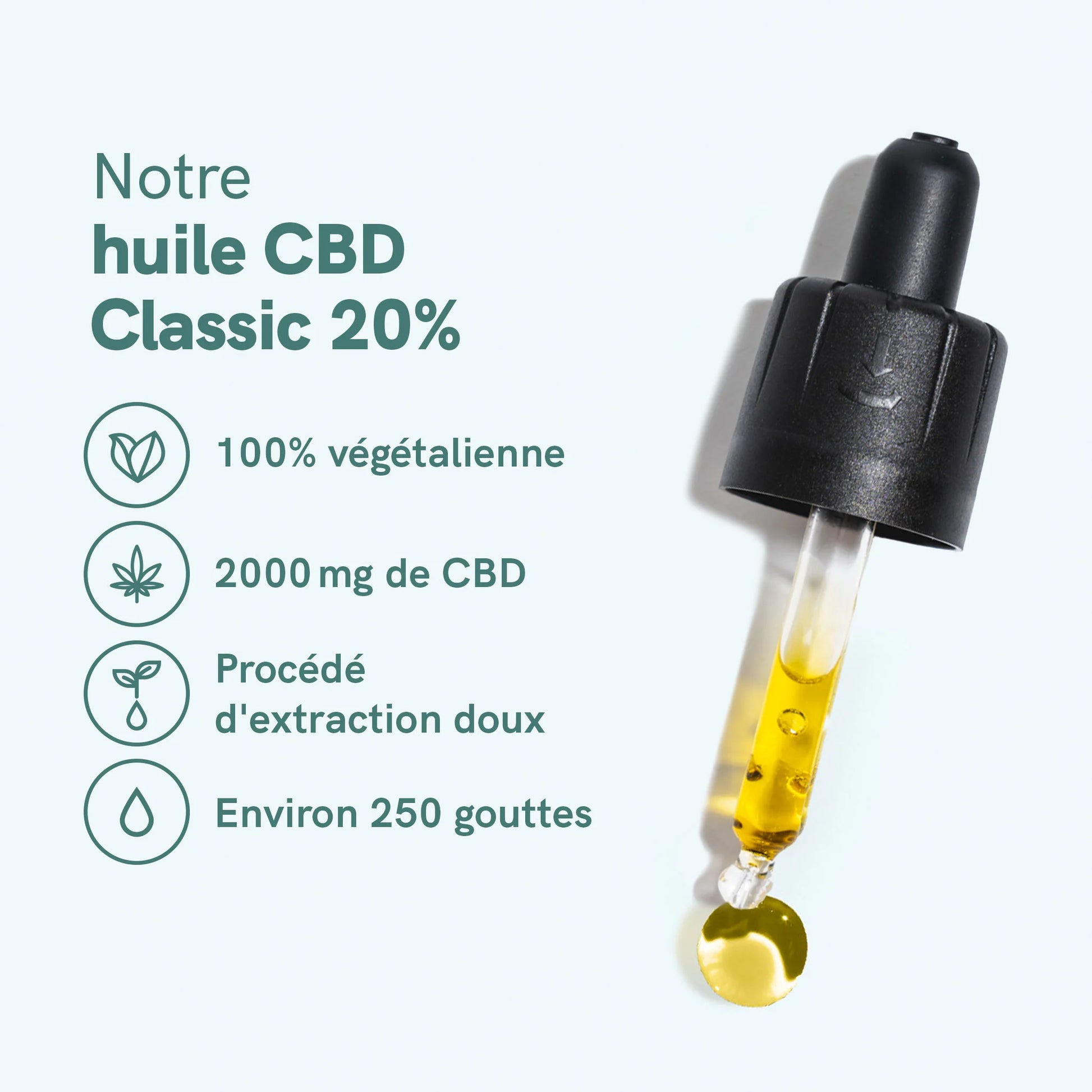 Pour nos utilisateurs expérimentés, nous avons mis au point une huile CBD 20 % CLASSIC qui contient une large gamme de cannabinoïdes obtenus par extraction. Notre huile de CBD de force moyenne combine de l'huile de graines de chanvre, 2000 mg de CBD et des terpènes. Cette huile de CBD végétalienne à 20 % est fabriquée à partir d'ingrédients naturels et, comme toutes nos huiles de CBD, elle ne contient pas de conservateurs ou de colorants artificiels.