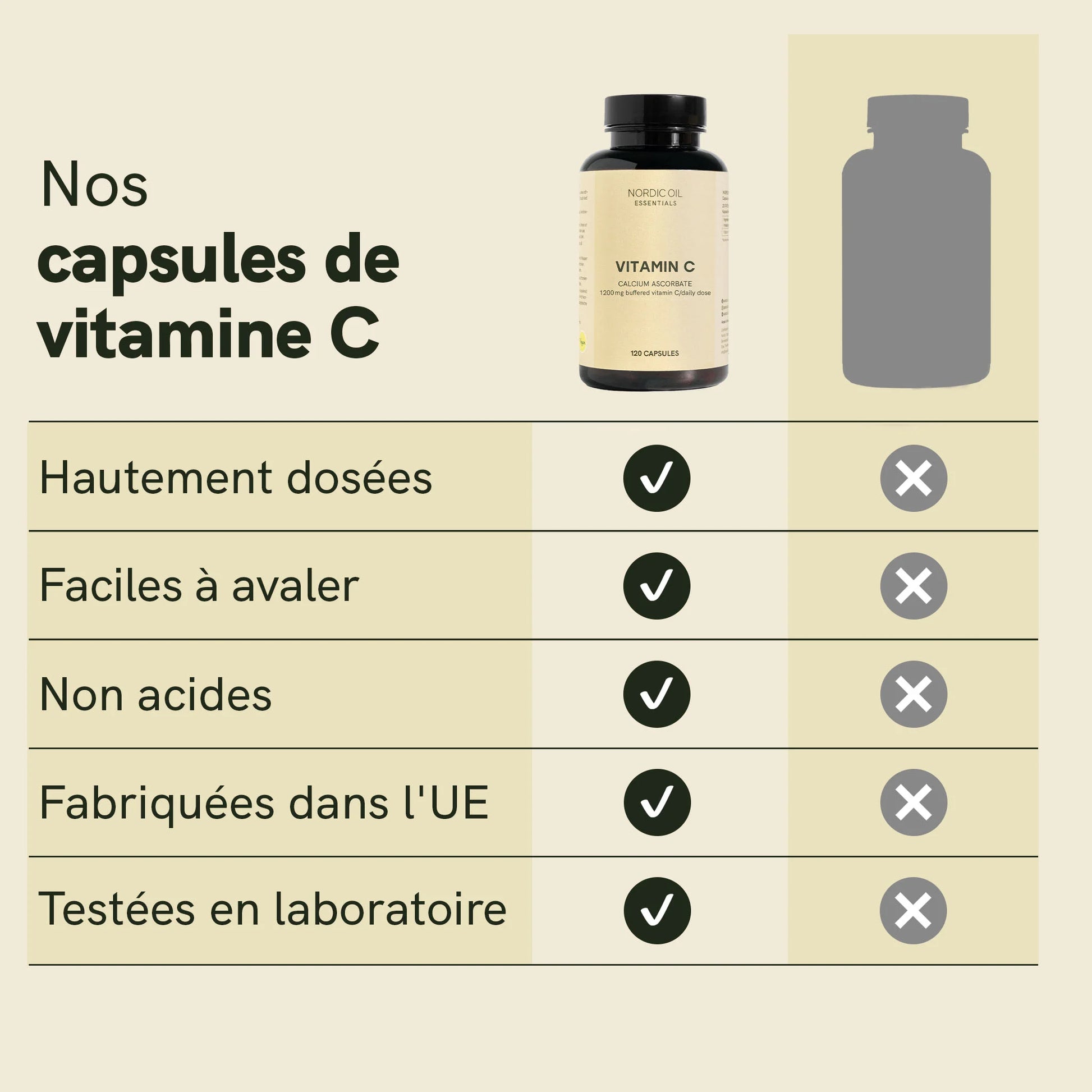 Nos capsules à haute dose de vitamine C offrent un soutien en douceur, en particulier pendant la saison froide. Fabriquées avec de l'ascorbate de calcium, une forme non acide de vitamine C, ces capsules sont douces pour l'estomac, ce qui les rend parfaites même pour les personnes ayant un système digestif sensible. Chaque paquet contient 120 capsules végétaliennes, formulées sans gluten, lactose, sucre ou additifs artificiels.