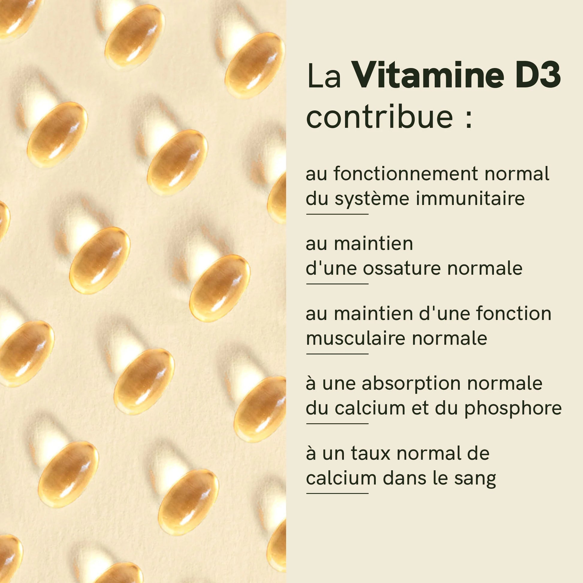 - Calcium : la D3 augmente l'absorption du calcium et soutient la solidité des os.