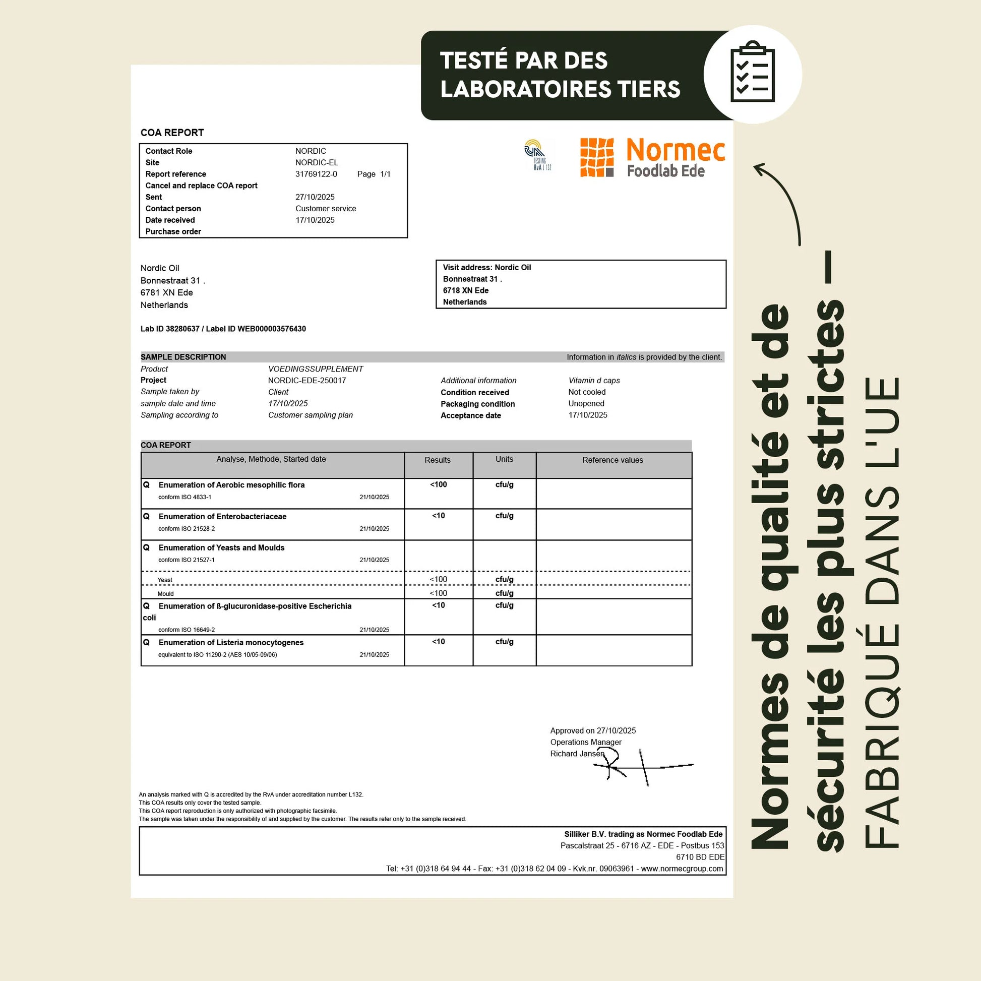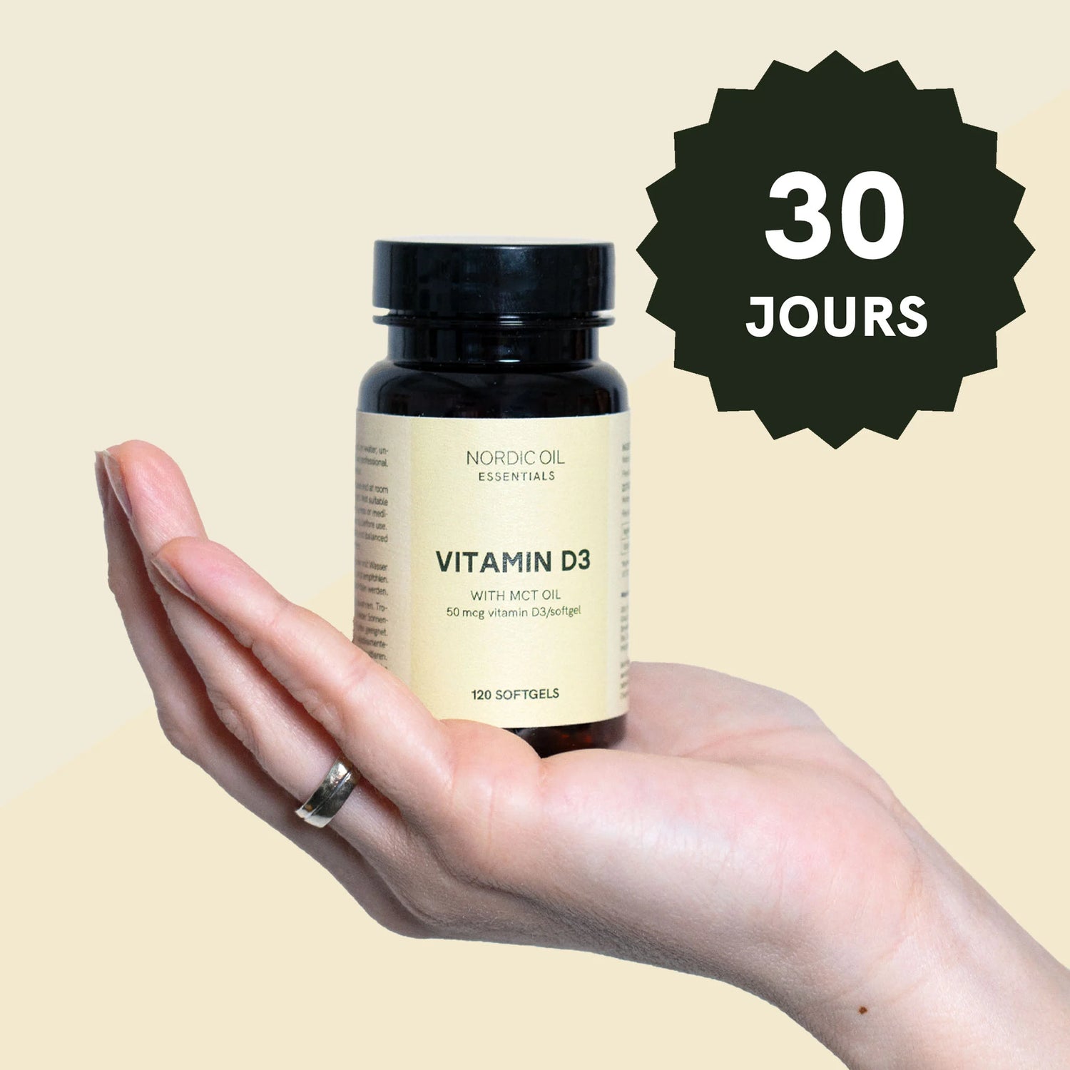 Les capsules de vitamine D3 de Nordic Oil sont un complément alimentaire de haute qualité pour soutenir les os, les dents, les muscles et les fonctions immunitaires. Chaque emballage contient 120 gélules softgel, suffisamment pour quatre mois. Une seule capsule softgel fournit 50 mcg de vitamine D3, ce qui correspond à 1000 % de la valeur nutritionnelle de référence (VNR). Ces capsules de vitamine D3 sont végétaliennes, fabriquées dans l'UE et testées en laboratoire selon des normes strictes afin de garantir la meilleure qualité. Elles sont exemptes d'arômes et de colorants artificiels et contiennent de l'huile MCT de noix de coco pour une meilleure absorption. Ce produit est idéal pour tous ceux qui souhaitent assurer leur apport quotidien en vitamine D de manière simple et efficace.
