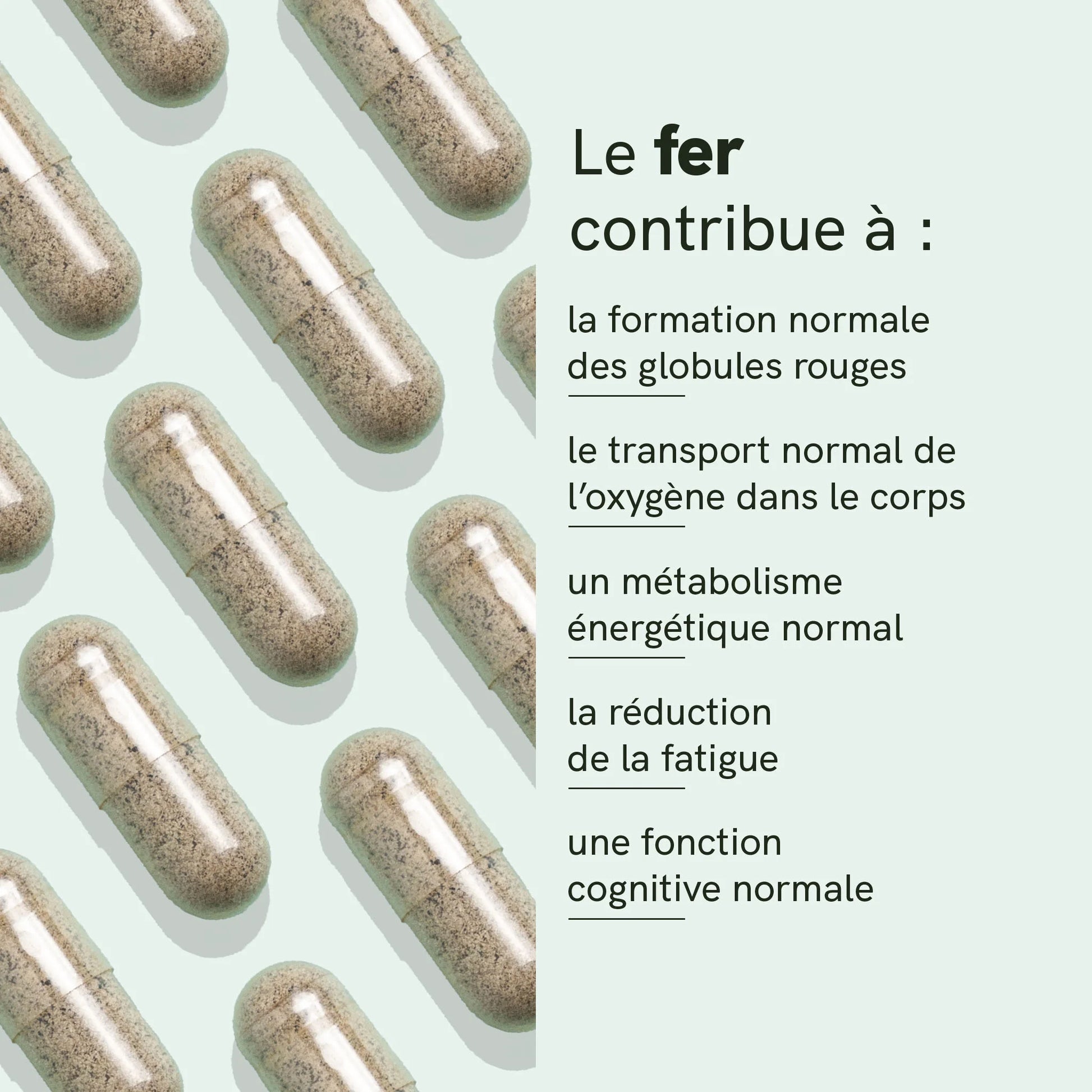 Le fer contribue à réduire la fatigue, à soutenir le métabolisme énergétique ainsi qu'à maintenir la fonction cognitive. La vitamine C agit en synergie pour soutenir le système immunitaire, renforcer la formation du collagène et améliorer l’absorption du fer.
