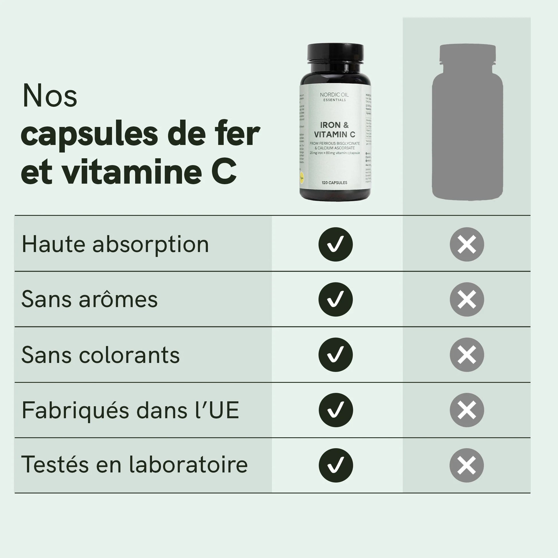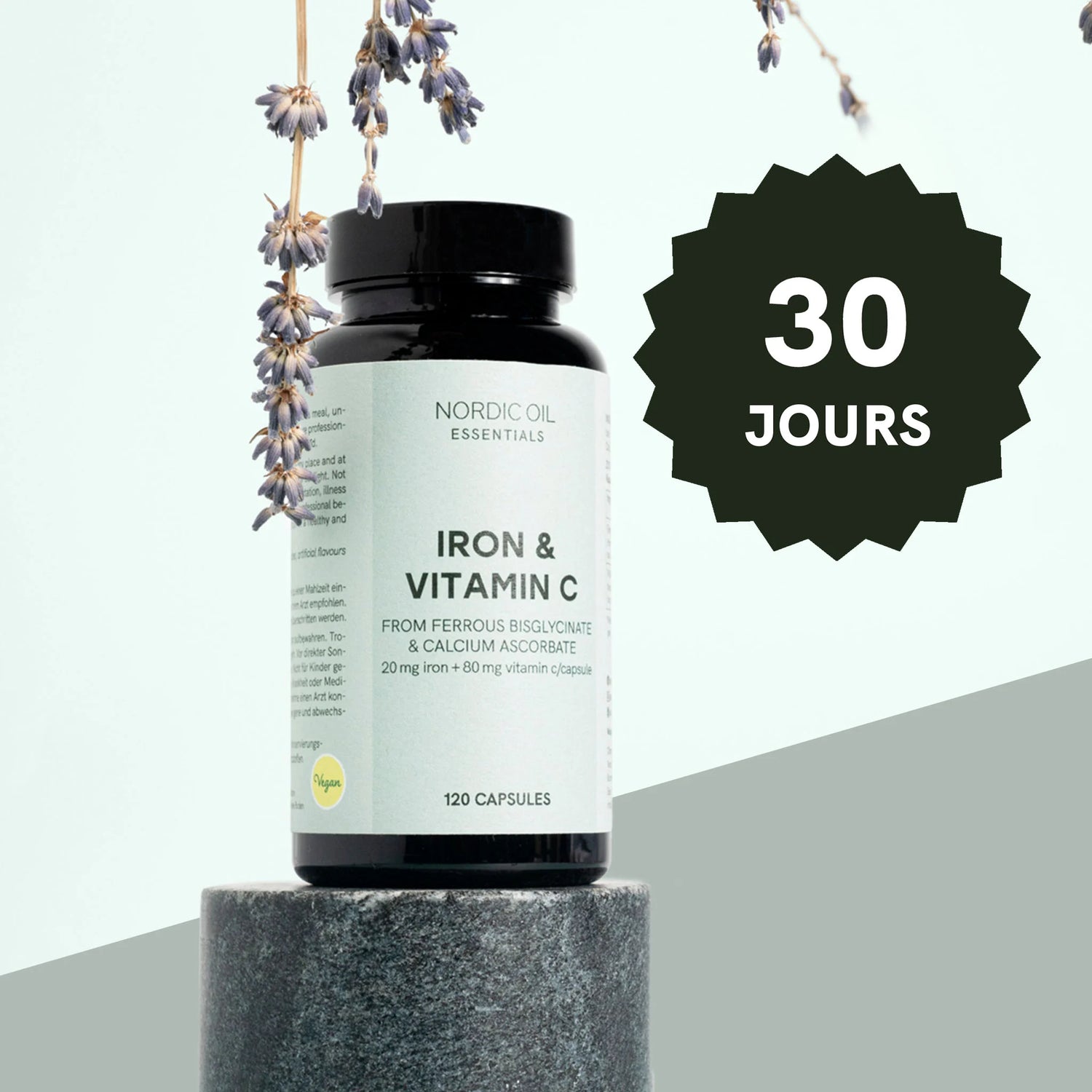 La combinaison de fer et de vitamine C offre un moyen plus efficace de soutenir les fonctions naturelles de l'organisme. Le fer est important pour le transport de l’oxygène dans le sang et la production d’énergie, tandis que la vitamine C favorise l’absorption du fer dans le tube digestif. Cette combinaison améliore la capacité du corps à mieux absorber et utiliser le fer, contribuant ainsi à une meilleure santé globale, notamment en soutenant le système immunitaire et en réduisant la fatigue.