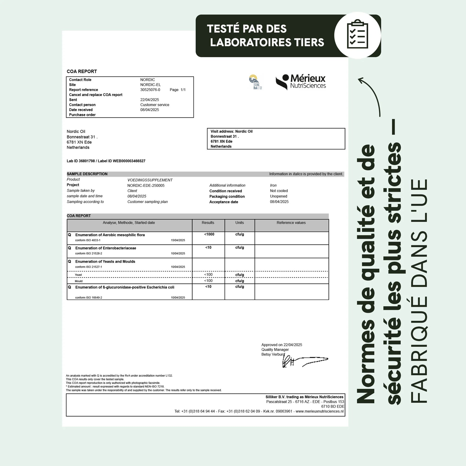 Nos capsules Fer & Vitamine C associent 20 mg de fer élémentaire à 80 mg d’ascorbate de calcium (une forme douce de vitamine C) par capsule, pour un soutien efficace de votre énergie et de votre bien-être. Le fer est issu de bisglycinate de fer, une forme hautement biodisponible garantissant une excellente absorption, tandis que la vitamine C renforce ce processus et soutient le métabolisme énergétique naturel de votre corps.