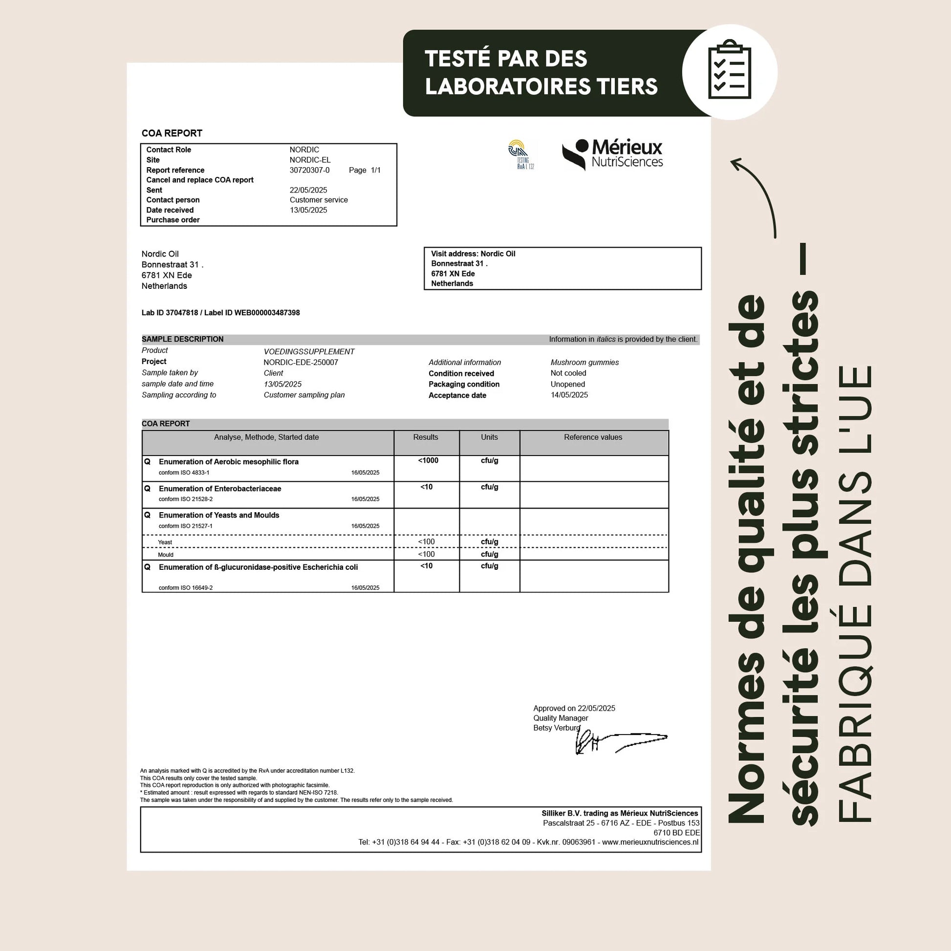 50 mg d'extrait de champignon biologique 20:1 par portion - équivalent à 1000 mg de corps de champignons fructifères bruts.