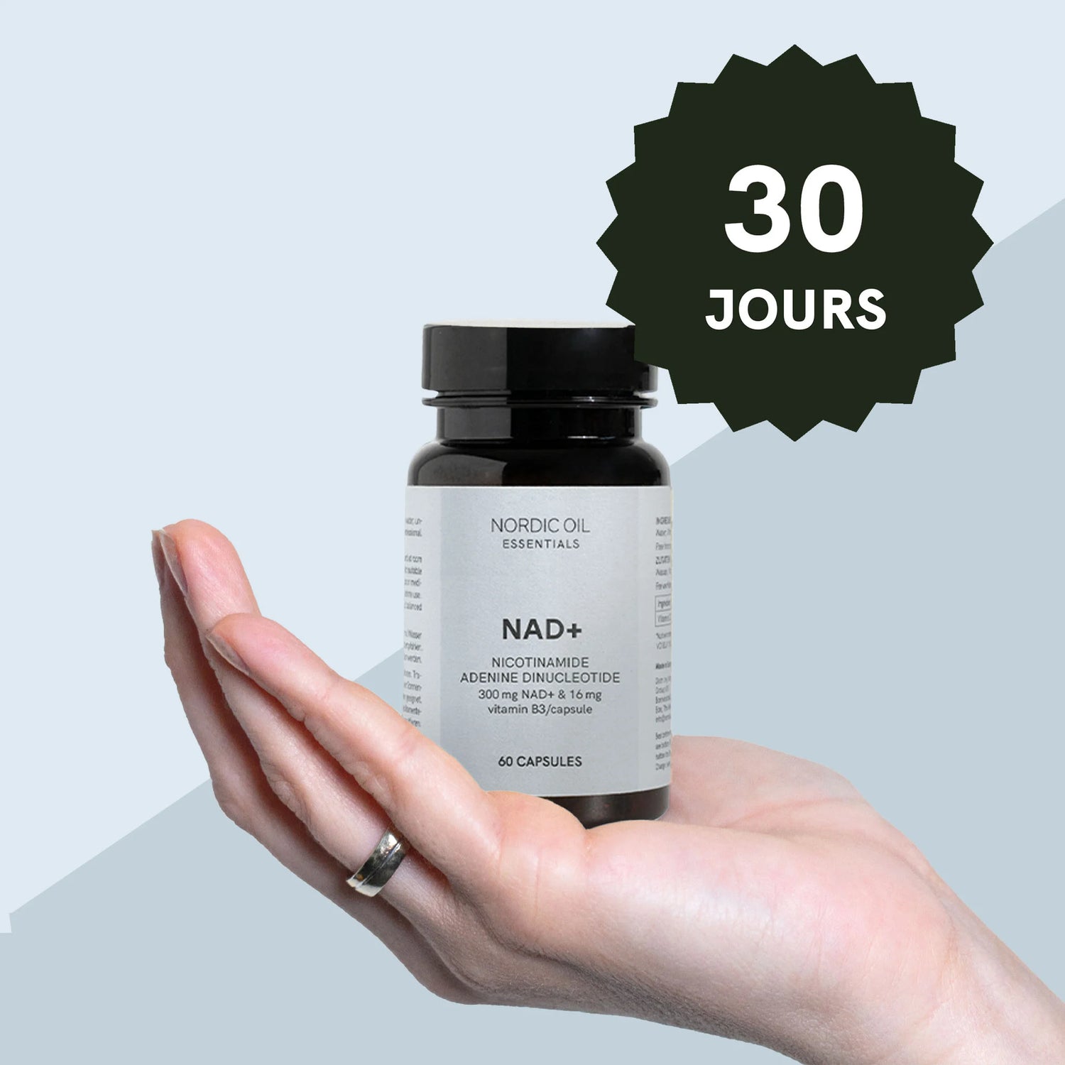 Les capsules de Nicotinamide Adénine Dinucléotide (NAD+) de Nordic Oil rassemblent deux composants puissants : 300 mg de NAD+ et 16 mg de nicotinamide (vitamine B3) par capsule.