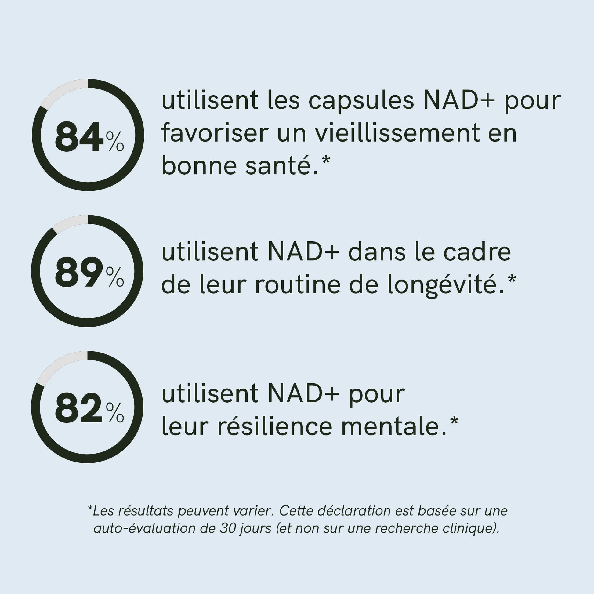 Beaucoup de personnes intègrent des compléments de NAD+ dans leur routine axée sur la longévité parce que cette molécule est largement étudiée en physiologie du vieillissement et pour le bien‑être cellulaire à long terme. Notre formule associe le NAD+ à la nicotinamide, qui contribue à la fonction psychologique normale et à la réduction de la fatigue — ce qui la rend adaptée aux routines centrées sur la clarté, la vitalité et l'équilibre général.