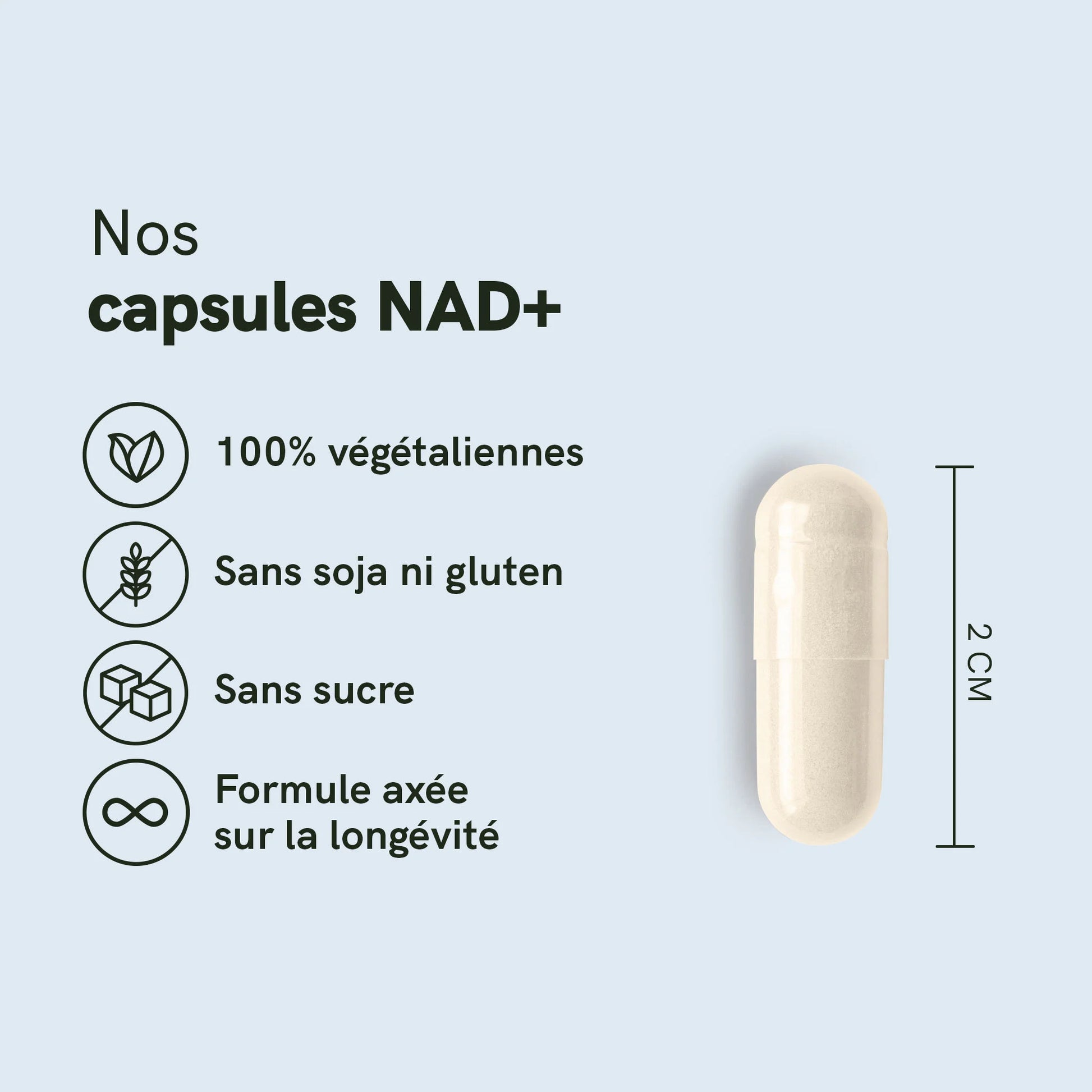- Capsules de NAD+ pour soutenir la vitalité et un vieillissement harmonieux