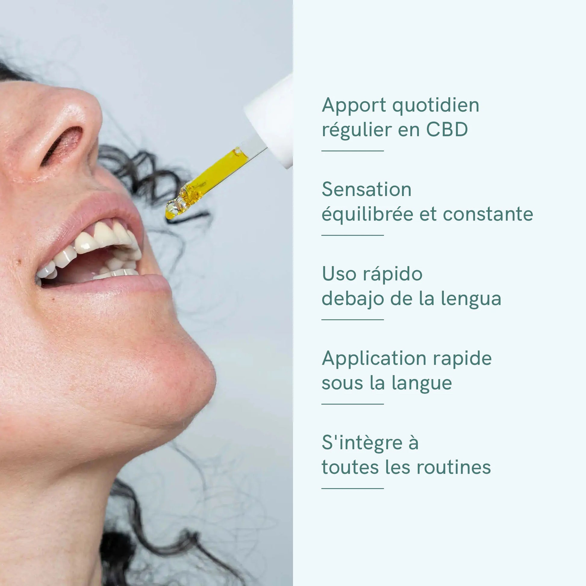 L'huile de CBD coule souvent sous la langue, car l'ingrédient actif peut être absorbé directement par la muqueuse buccale. Cette application sublinguale permet un début d’action plus rapide que la déglutition car le CBD contourne le tube digestif et passe directement dans la circulation sanguine. Il est recommandé de garder l'huile dans la bouche pendant environ 60 secondes avant d'avaler pour une absorption optimale.